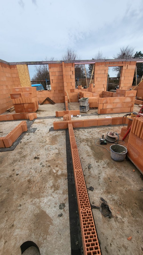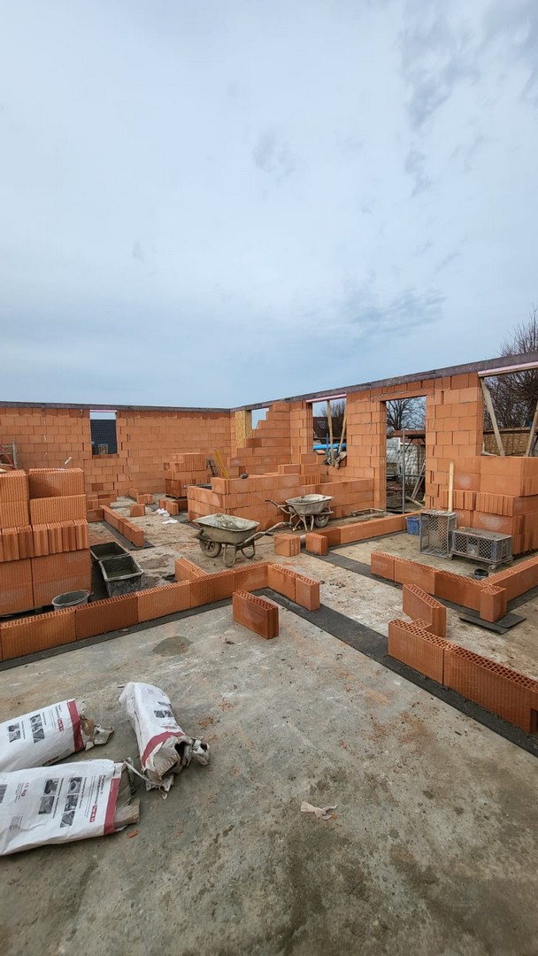 Mittwoch, 31.01.2024. Eigentlich sollte Richttermin sein (Wände und Dachstuhl fertig). Was sollen wir sagen => kein Dachstuhl drauf. Wenn wir ein Richtfest geplant hätten mit Einladungen und Essen etc wäre es nicht lustig gewesen...