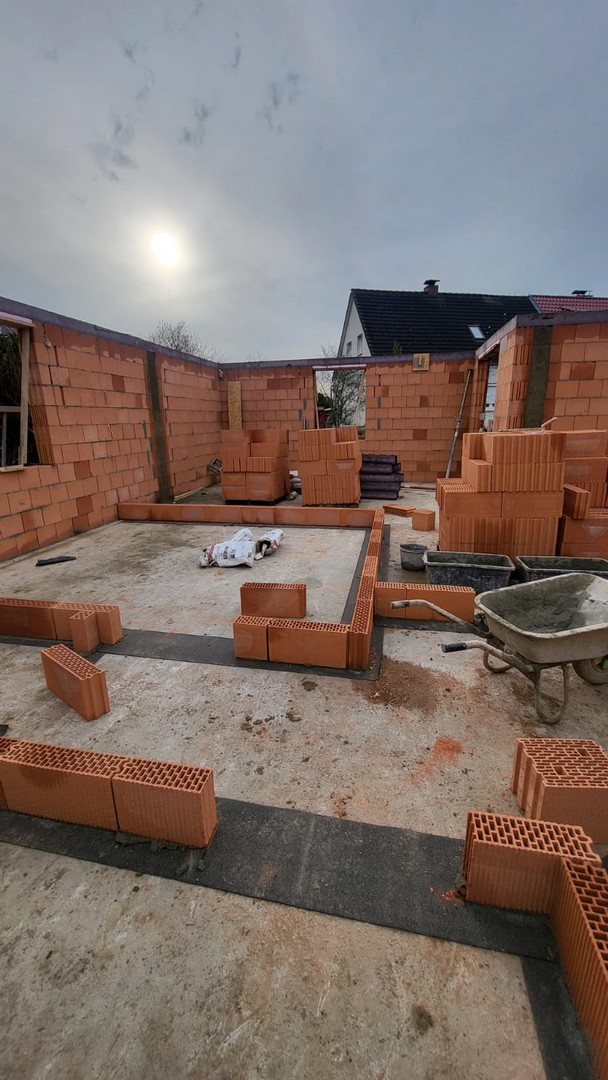 Mittwoch, 31.01.2024. Eigentlich sollte Richttermin sein (Wände und Dachstuhl fertig). Was sollen wir sagen => kein Dachstuhl drauf. Wenn wir ein Richtfest geplant hätten mit Einladungen und Essen etc wäre es nicht lustig gewesen...